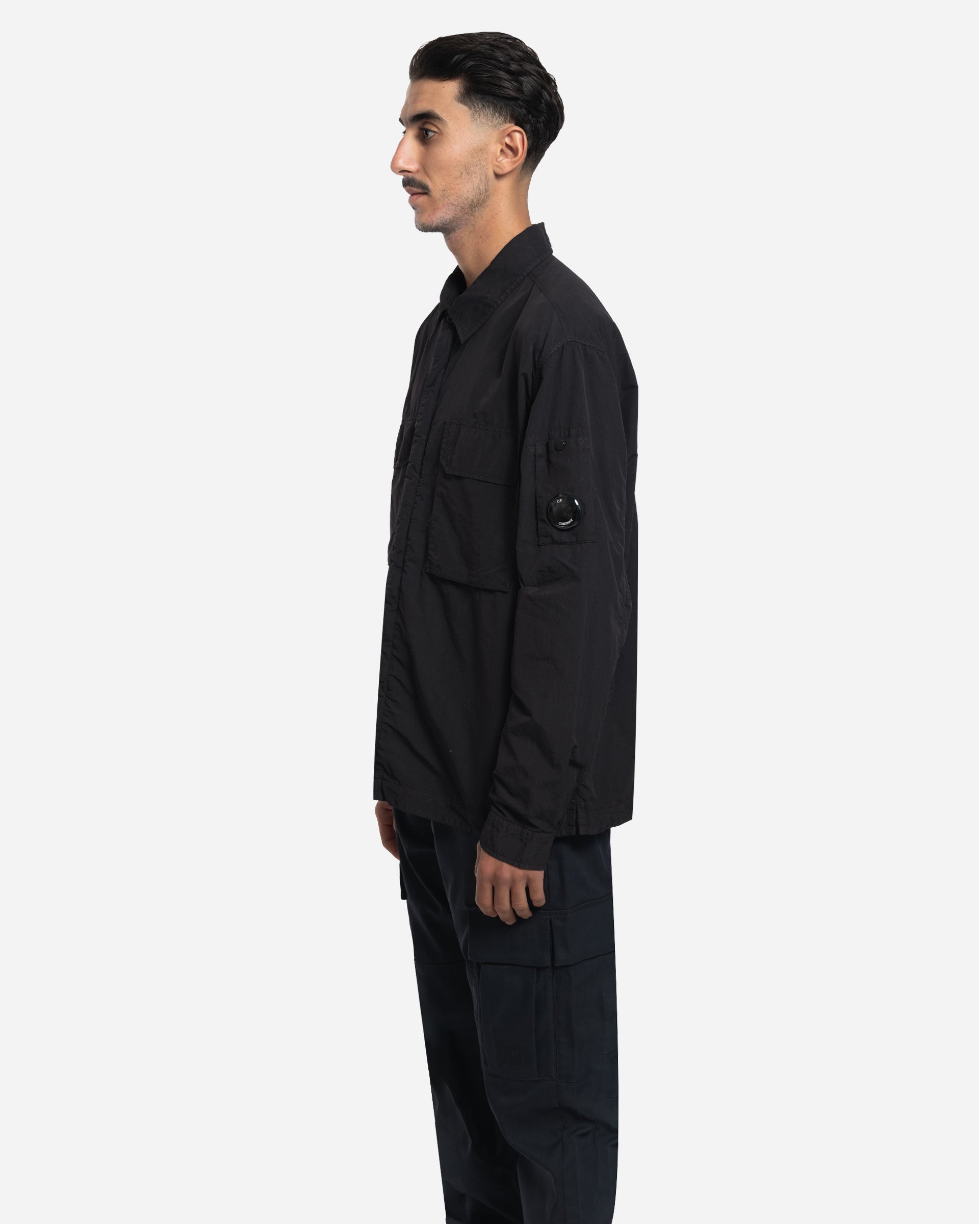 Surchemise, C.P. Company, Flatt Nylon, black, lentille emblématique, fermeture à glissière cachée, double sens, poches à rabat, poitrine, doublure sergé de coton, teint en pièce, anti-goutte, coupe régulière, col classique, poignets réglables