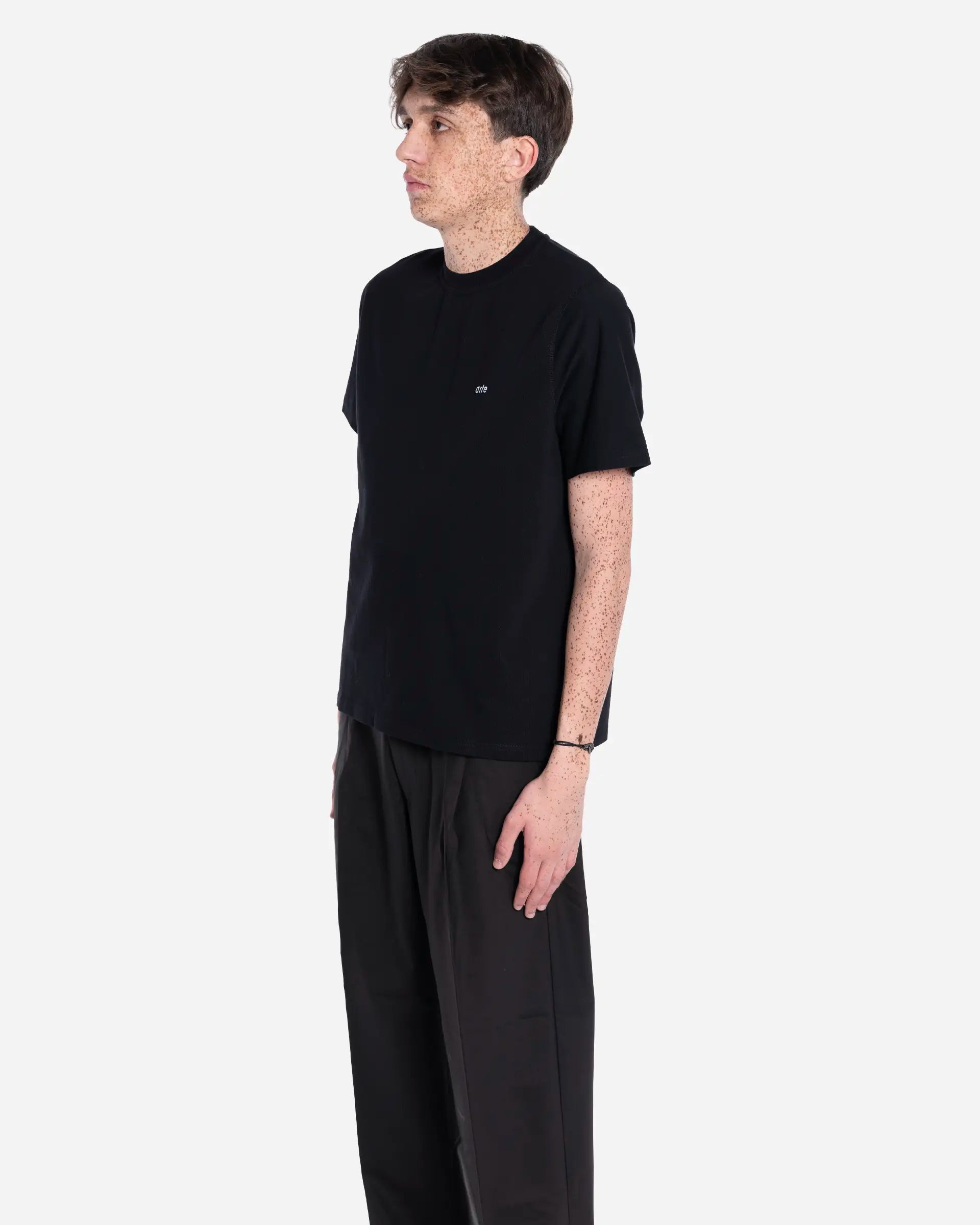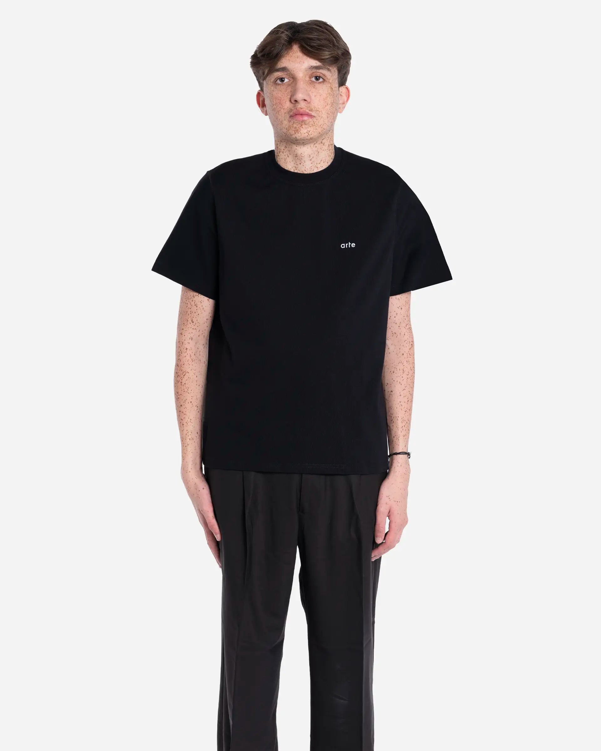T-shirt de la marque Arte Antwerp en noir. Ce modèle présente une œuvre d'art sérigraphiée en blanc dans le dos avec le slogan "Arte For All" intégrant un globe terrestre. Le logo Arte est brodé en petit sur la poitrine à l'avant. Fabriqué en coton épais de première qualité, doux au toucher avec une encolure légèrement plus haute et une coupe décontractée. Cette pièce fait partie de la collection Automne/Hiver 2025. Fabriqué au Portugal.