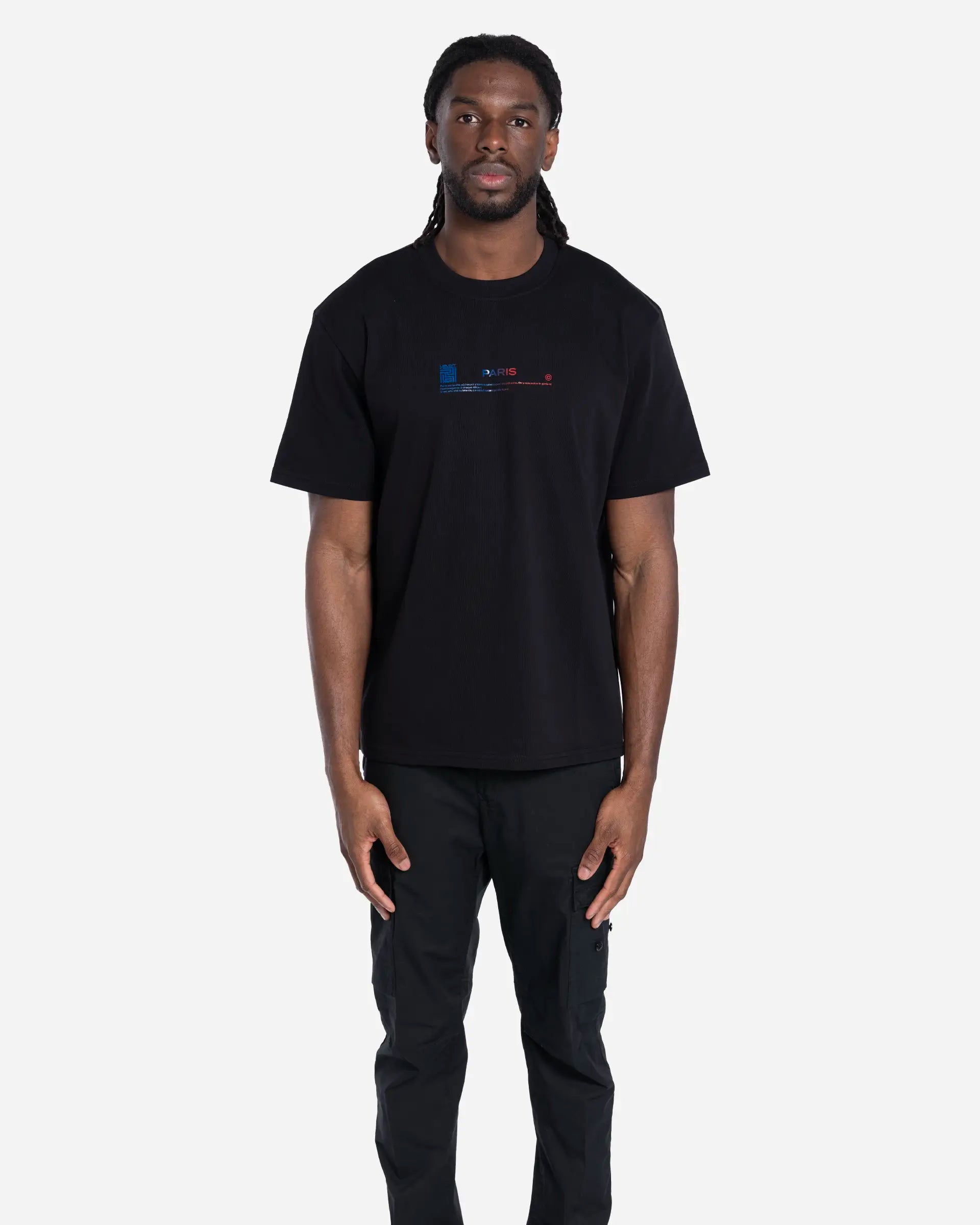 Col rond classique. Manches courtes. Logo Lieu-Dit centré sur la poitrine avec dégradé bleu et rouge. Grand imprimé graphique géométrique style labyrinthe au dos, rehaussé d'effets d'éclaboussures de peinture et d'une citation sur la ville de Paris.